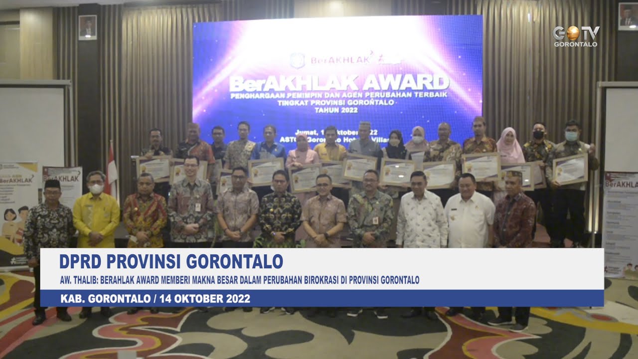 acara BerAkhlak Award Penghargaan Pemimpin dan Agenda Perubahan terbaik tingkat Provinsi Gorontalo Tahun 2022 disamping dihadiri langsung Menteri Pendayagunaan Aparatur Negara dan Reformasi Birokrasi (PANRB), Abdullah Azwar Anas, Pejabat Gubernur Gorontalo Hamka Hendra Noer, Ketua Komisi I Deprov. AW. Thalib, Bupati/Walikota Kabupaten Kota, Anggota DPRD Provinsi Kabupaten Kota dan unsur Forkopimda Provinsi Gorontalo. (adv)