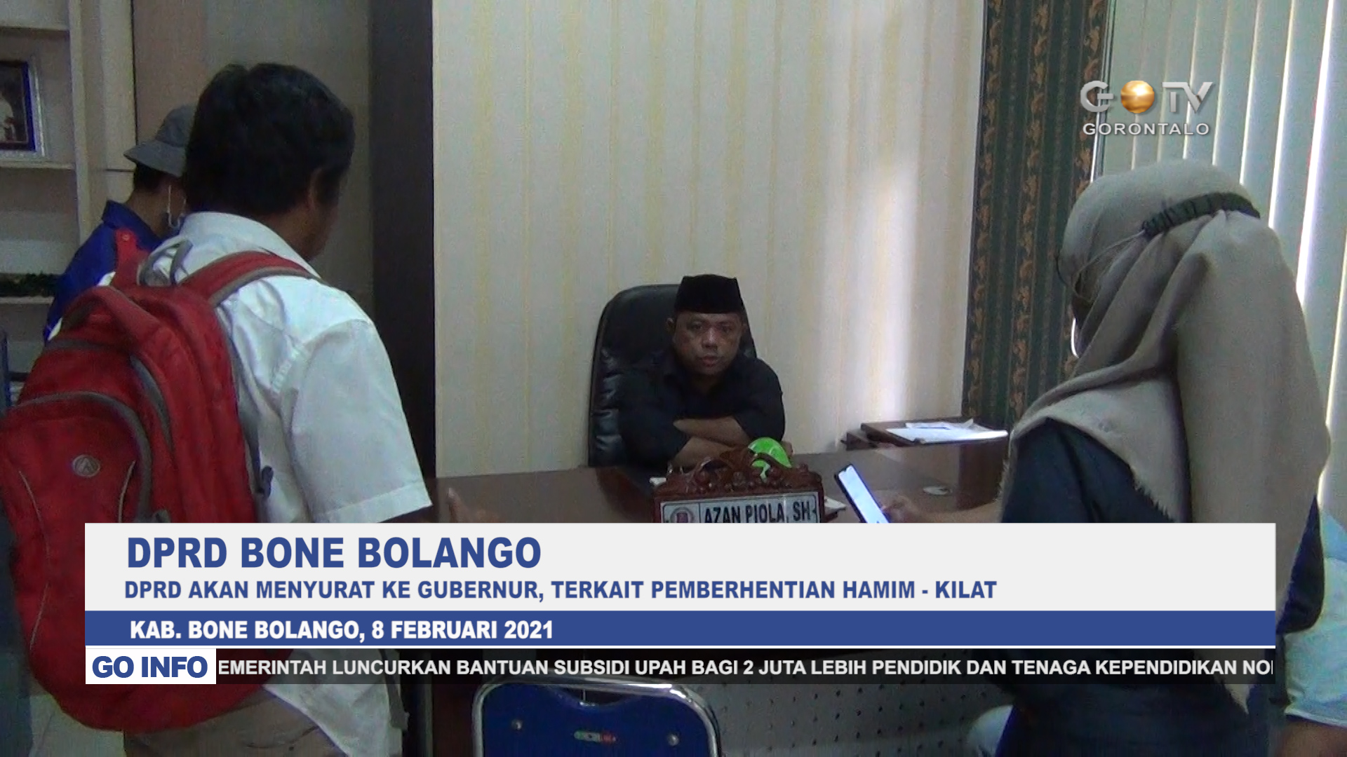 GOTV – Wakil Ketua DPRD Bone Bolango Azan Piola yang ditemui diruang kerjanya mengatakan, DPRD Bone Bolango akan menyurat ke Gubernur Gorontalo, untuk selanjutanya di teruskan Ke Kementrian Dalam Negeri, terkait pemberhentian Bupati dan Wakil Bupati Bone Bolango, masa bakti tahun 2016-2021, Hamim Pou – Kilat Wartabone.