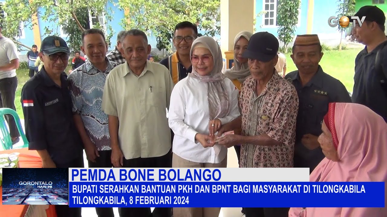 GOTV – Bupati Bone Bolango Merlan Uloli menyerahkan bantuan Program Keluarga Harapan (PKH) dan Bantuan Pangan Non Tunai (BPNT) kepada masyarakat di 3 desa di Kecamatan Tilongkabila. Bantuan bagi 334 penerima manfaat diserahkan di aula kantor Camat Tilongkabila, Kamis (8/2/2024).