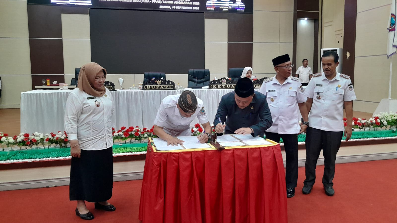 DPRD Kabupaten Pohuwato saat menggelar Rapat Paripurna ke-24 dengan agenda pembicaraan tingkat II penandatanganan berita acara persetujuan bersama Rancangan Peraturan Daerah (Ranperda) Rencana Tata Ruang Wilayah (RTRW) tahun 2025–2044, serta persetujuan bersama Kebijakan Umum Anggaran dan Prioritas Plafon Anggaran Sementara (KUA-PPAS) tahun anggaran 2026.