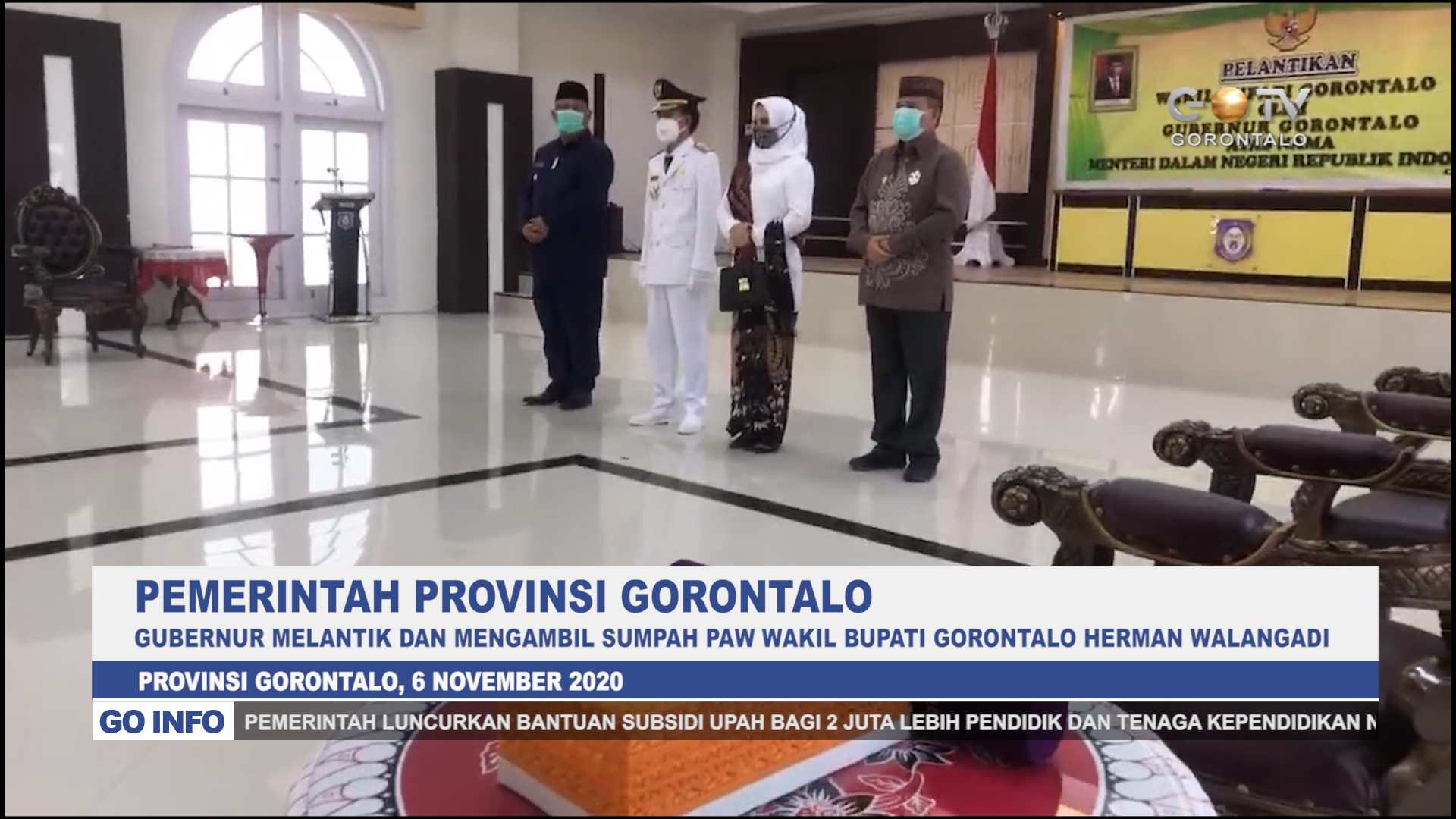GOTV – Gubernur Gorontalo Rusli Habibie melantik Pejabat Antar Waktu (PAW) Wakil Bupati Gorontalo sisa masa jabatan 2016-2021, Herman Walangadi. Herman dilantik berdasarkan Surat Keputusan Menteri Dalam Negeri nomor 132.75-3768 tahun 2020 tentang Pengesahan dan Pengangkatan Wakil Bupati Gorontalo Provinsi Gorontalo, bertempat di aula rumah jabatan Gubernur, Kamis (05/11/2020).