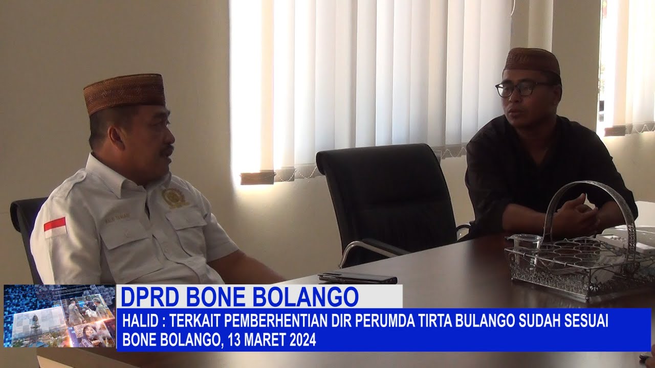 GOTV – Ketua DPRD Bone Bolango Halid tangahu menilai pemberhentian Direktur Perusahaan Umum Daerah (Perumda) Tirta Bulango sudah tepat. Hal tersebut disampaikannya dihadapan sejumlah wartawan saat diwawancarai diruang kerjanya. Kamis (13/3/2024).