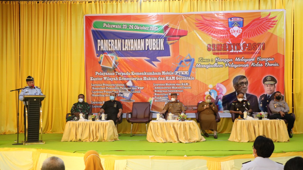 Gorontalo.tv.Pohuwato – Dalam rangka memeriahkan Hari Dharma Karyadhika (HDKD) Tahun 2021, Kantor Wilayah (Kanwil) Kementerian Hukum dan HAM (Kemenkumham) Gorontalo melaksanakan kegiatan Pameran Pelayanan Publik dengan tema “Bangga Melayani Bangsa Mewujudkan Pelayanan Kelas Dunia”. Kegiatan yang dilaksanakan di Aula Panua kantor Bupati Pohuwato ini dihadiri oleh Bupati Pohuwato, Wakil Bupati dan seluruh unsur Forum Komunikasi Pimpinan Daerah (Forkopimda) Kabupaten Pohuwato, Selasa (26/10/2021)