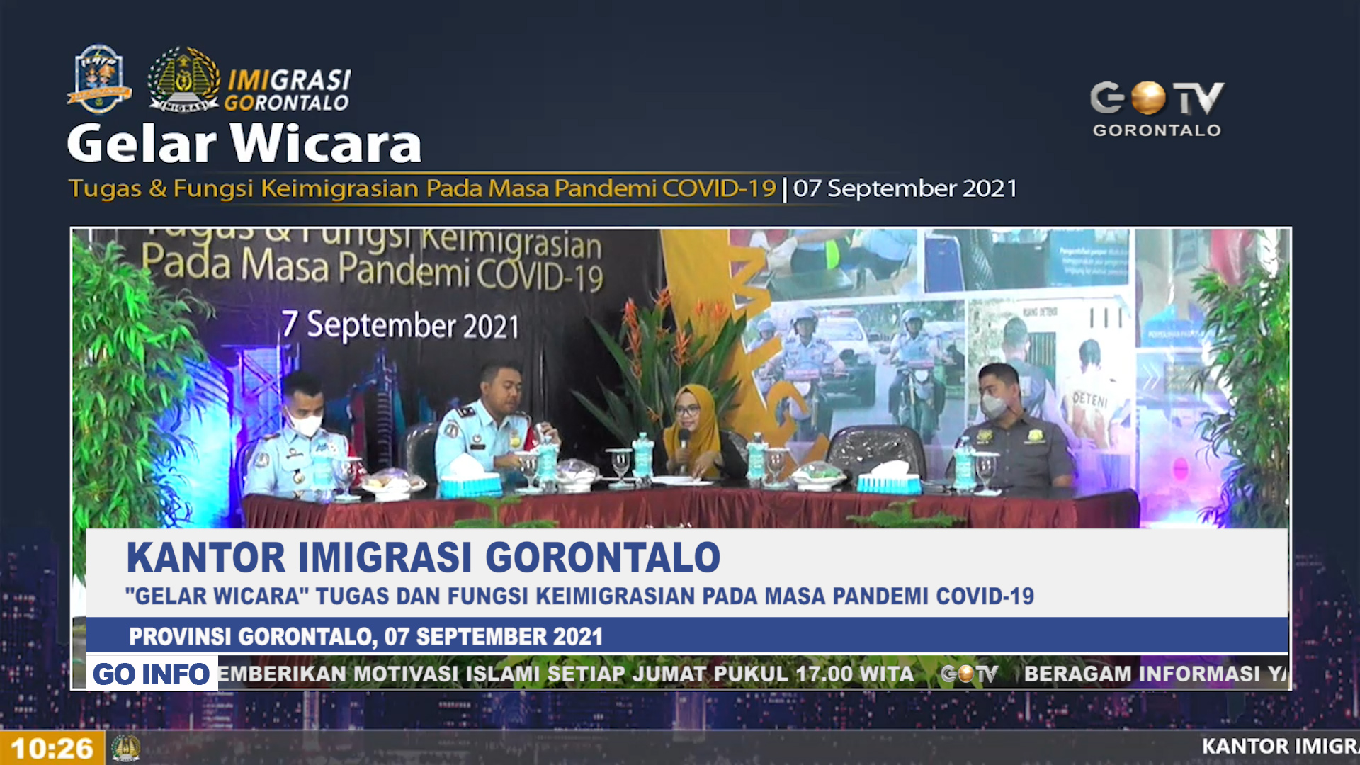 GOTV – Untuk memaksimalkan pelayanan keimigrasian serta mencegah penyebaran Covid-19, Dirjen Imigrasi Kementrian Hukum dan HAM RI, telah mengeluarkan sejumlah kebijakan terkait pelaksanaan tugas dan fungsi keimigrasian. Hal tersebut disampaikan oleh Kepala Kantor Imigrasi kelas I TPI Gorontalo, Muhamad Irham Anwar, saat memberikan sambutan dikegiatan Gelar Wicara yang mengangkat topik pelaksanaan tugas dan fungsi Keimigrasian pada masa Pandemi Covid-19.