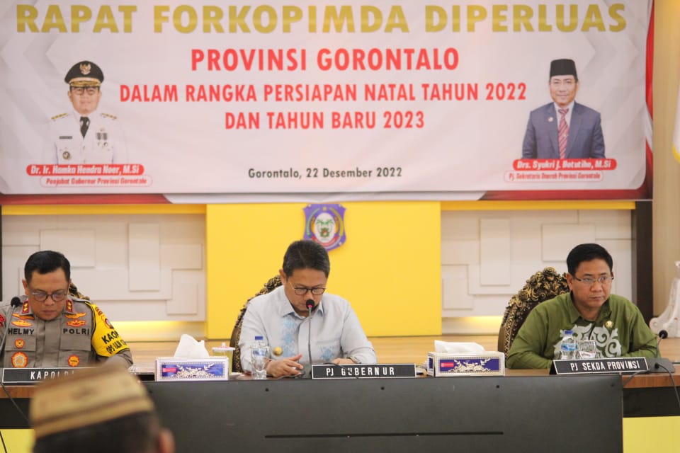 Rapat Forkopimda diperluas bersama Instansi terkait , dalam rangka persiapan menghadapi Natal dan Tahun Baru dipimpin langsung pejabat Gubernur Hamka Hendra Noer, turut dihadiri Kapolda Gorontalo, Forum Kerukunan Umat Beragama (FKUB) Provinsi Gorontalo dan Forum Kewaspadaan Dini Masyarakat (FKDM) Provinsi Gorontalo.(Ricky/adv)