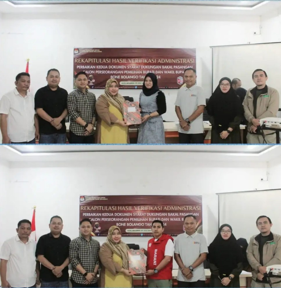 Pelaksanaan Rekapitulasi Hasil Verifikasi Administrasi Perbaikan Kedua dari jalur perseorangan bagi pasangan Ismet Mile – Risman Tolingguhu (IRIS) dan pasangan Amran Mustapa – Irwan Mamesah (AMIN) dipimpin langsung Ketua KPU Bone Bolango Sutenty Lamuhu dilaksanakan tepat pada pukul 10.00 Wita di Kantor KPU Bone Bolango. Sabtu (27/07/2024).