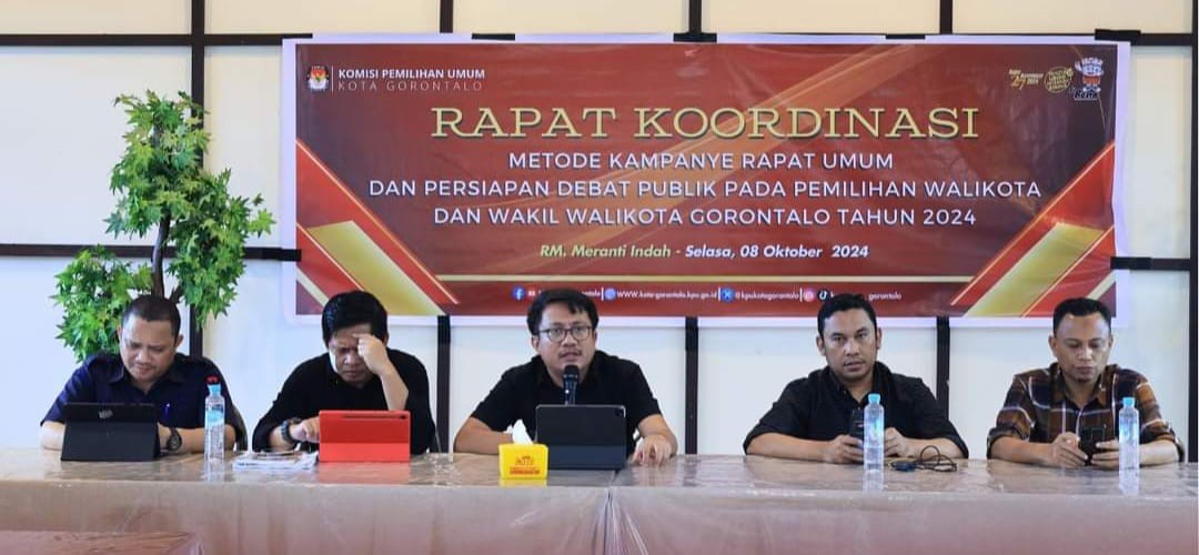 GOTV.Network.KPU – Komisi Pemilihan Umum (KPU) Kota Gorontalo menggelar Rapat Koordinasi Metode Kampanye Rapat Umum Debat Publik Pada Pemilihan Walikota dan Wakil Walikota Gorontalo Tahun 2024. Rakor ini dihadiri oleh Liaison Officer (LO) masing-masing pasangan calon, pihak kepolisian, perwakilan Dandim 1304 Gorontalo, Bawaslu Kota Gorontalo, Kaban Kesbangpol Kota Gorontalo dan Dinas Pariwisata Kota Gorontalo. Rakor ini berlangsung di RM. Meranti, Bonebolango pada Selasa (8/10/2024).