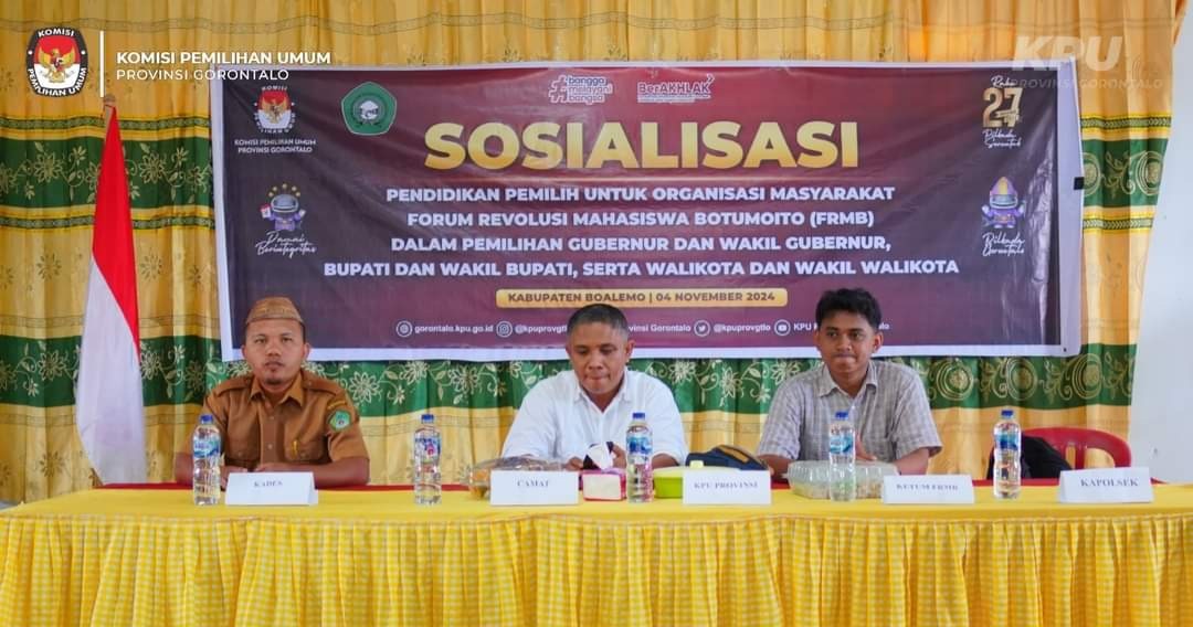 GOTV.Network.KPU – Anggota KPU Provinsi Gorontalo Opan Hamsah Menggelar kegiatan sosialisasi Pendidikan Pemilih Untuk Organisasi Masyarakat Forum Revolusi Mahasiswa Botumoito (FRMB) Dalam Pemilihan Gubernur dan Wakil Gubernur, Bupati dan Wakil Bupati, serta Walikota dan Wakil Walikota Bertempat di Aula Kantor Desa Hutamonu Kabupaten Boalemo, Senin (4/11/2024)