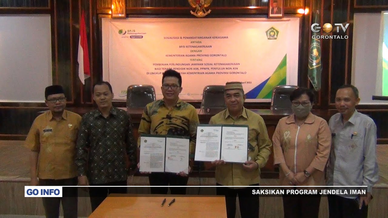 GOTV – Badan Penyelenggara Jaminan Sosial (BPJS) Ketenagakerjaan/BPJamsostek Cabang Gorontalo menandatangani perjanjian kerjasama dengan Kantor Wilayah Kementerian Agama (Kanwil Kemenag) Provinsi Gorontalo, di Aula Kanwil Kemenag setempat, Kamis (7/4/2022).