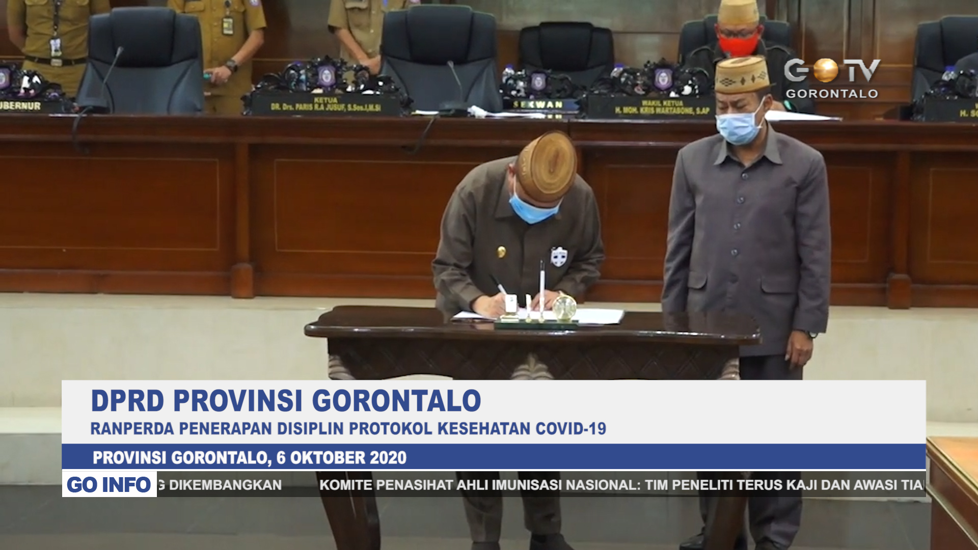 GOTV – Pemerintah Provinsi dan DPRD Provinsi Gorontalo sepakat menyetujui rancangan peraturan daerah (Ranperda) tentang Penerapan Disiplin dan Penegakan Hukum Protokol Kesehatan dalam Upaya Pencengahan dan Pengendalian Covid-19. Persetujuan terhadap Ranperda tersebut ditandatangani oleh Wakil Gubernur Idris Rahim dan pimpinan DPRD Paris RA. Jusuf, pada Rapat Paripurna, Selasa (06/10/2020).