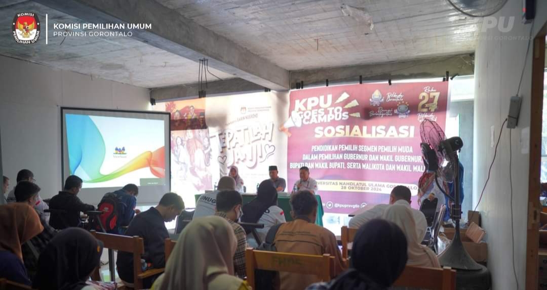 GOTV.Network. Anggota KPU Provinsi Gorontalo Risan Pakaya membuka Kegiatan Sosialisasi Pendidikan Pemilih Segmen Pemilih Muda Dalam Pemilihan Gubenur, Bupati dan Walikota Dalam Program Goes To Campus bertempat di Universitas Nahdatul Ulama Gorontalo Kota Gorontalo, Senin (28/10/2024)
