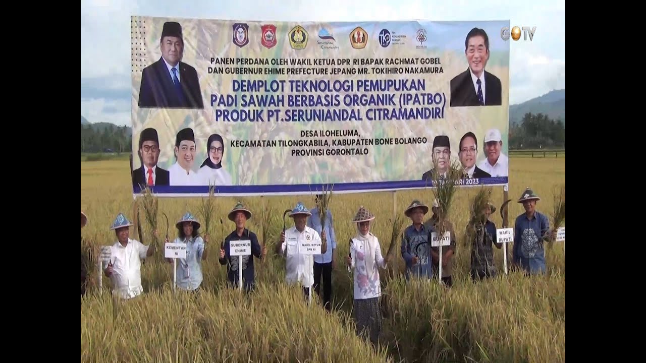 gorontalo.tv – Suatu Kebanggaan bagi Kabupaten Bone Bolango ketika Wakil Ketua DPR RI Rachmat Gobel bersama Gubernur Ehime Prefecture Jepang, Mr. Tokihiro Nakamura melakukan Panen Perdana, di areal Demplot teknologi pemupukan padi sawah berbasis organik (IPA TBO) Produk PT. Seruniandal Citramandiri, di Desa Iloheluma, Kecamatan Tilongkabila, Kamis (19/1/2023).