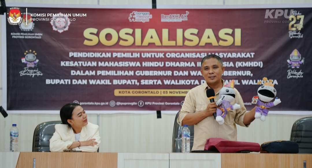 GOTV.Network.KPU – KPU Provinsi Gorontalo Menggelar kegiatan Sosialisasi Pendidikan Pemilih untuk Organisasi Masyarakat Kesatuan Mahasiswa Hindu Dharma Indonesia (KMHDI) dalam pemilihan Pemilihan Gubernur, Wakil Gubernur, Bupati, Wakil Bupati, serta Walikota dan Wakil Walikota, bertempat di Aula Kantor Kementerian Agama Kota Gorontalo, Minggu (3/11/2024)
