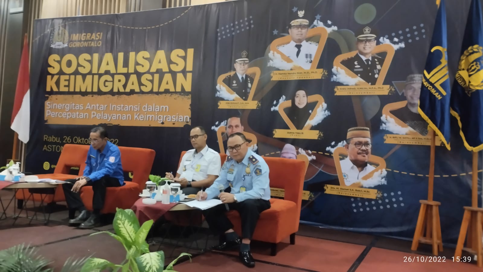 gorontalo.tv. – Dalam rangka mengimplementasikan arahan Presiden Republik Indonesia terkait percepatan layanan Keimigrasian khususnya bagi para investor asing yang ingin berinvestasi di Indonesia, Kantor Imigrasi kelas I TPI Gorontalo melaksanakan Kegiatan sosialisasi Keimigrasian dengan tema “sinergitas antar instansi dalam percepatan pelayanan keimigrasian”, yang berlangsung di ruang ballroom hotel Aston Kota Gorontalo, Selasa (26/10/2022).