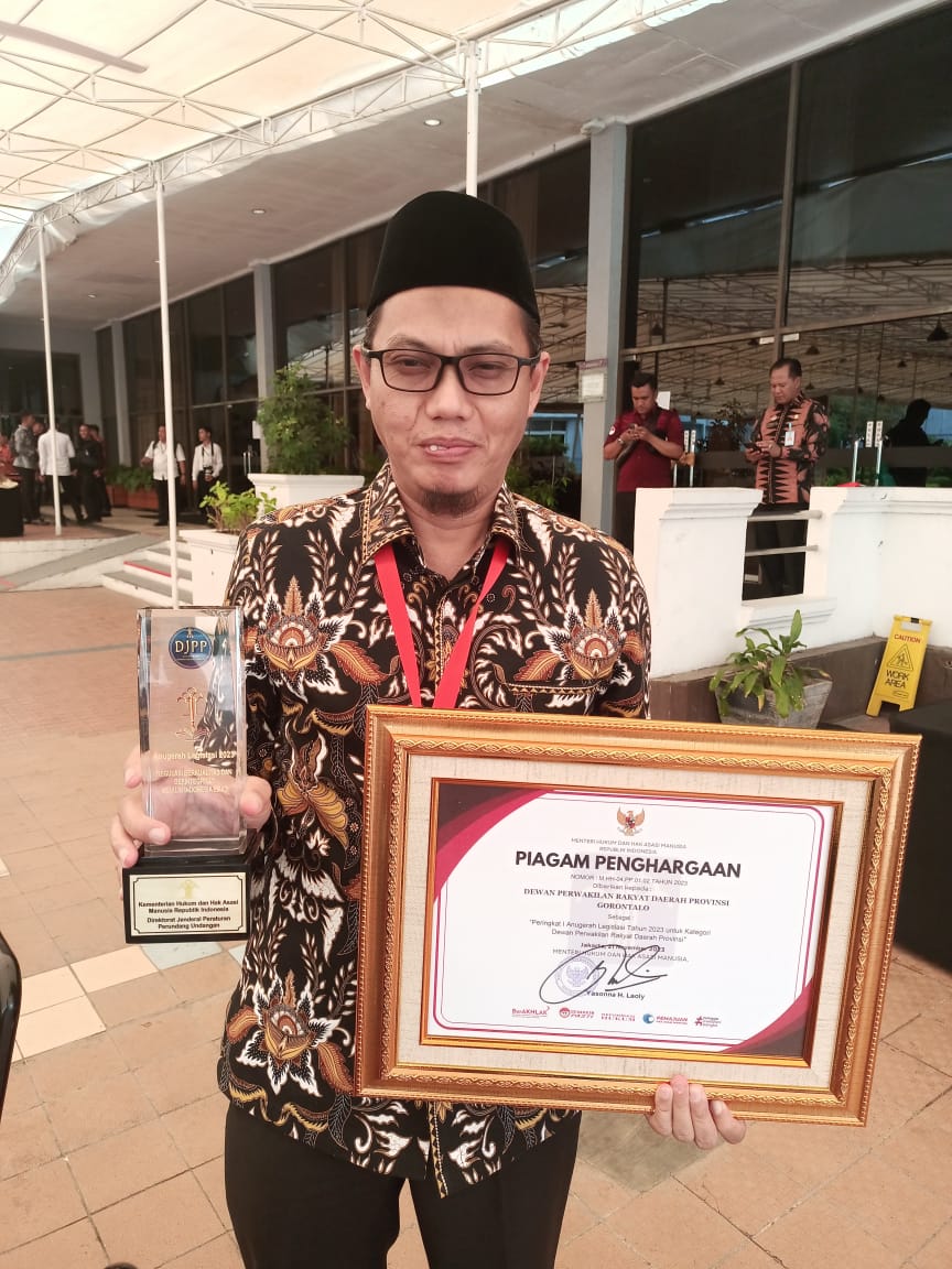 Penyerahan penghargaan Anugerah Legislasi Tahun 2023 diterima langsung Ketua DPRD Provinsi Gorontalo yang diwakili oleh Anggota DPRD Provinsi Gorontalo Adnan Entengo, berlangsung di Hotel Grand Mercure Jalan Hayam Wuruk Jakarta Pusat. Selasa (21/11/2023)