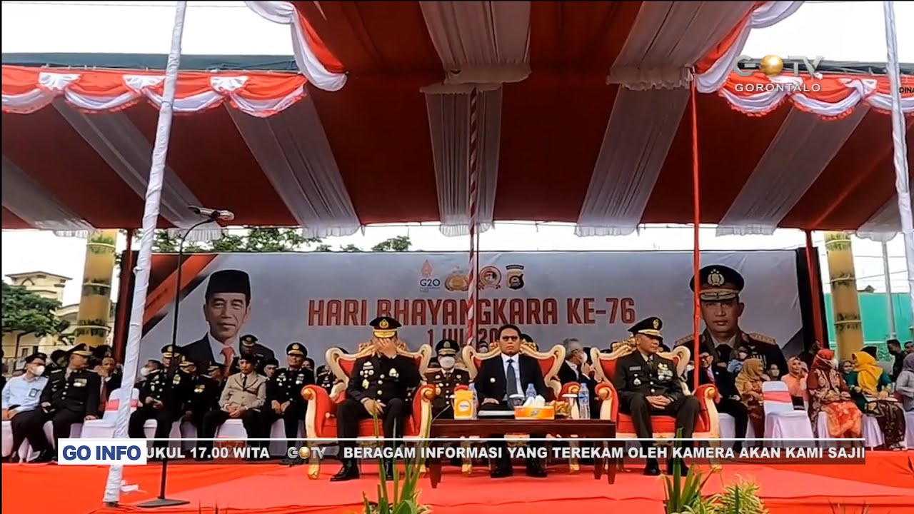 GOTV – Penjabat Gubernur Gorontalo Hamka Hendra Noer dan Kapolda Gorontalo Irjen Pol Helmy Santika bersama-sama mengikuti upacara peringatan hari ulang tahun (HUT) ke-76 Bhayangkara, secara virtual dari lapangan Mapolda Gorontalo, Selasa (5/7/2022).